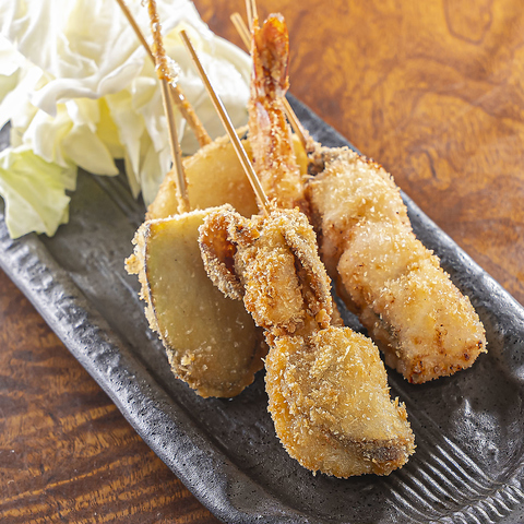 当店が一番のウリとしているのが、種類豊富な串カツです!定番の野菜串から、肉系や海鮮系まで、20種類以上を132円(税込)からとリーズナブルにご提供しております♪どれを頼むか迷ってしまったら、お得な海鮮または肉系のおまかせ5種盛りをご注文ください!揚げたてアツアツの串カツを、ぜひご堪能あれ!