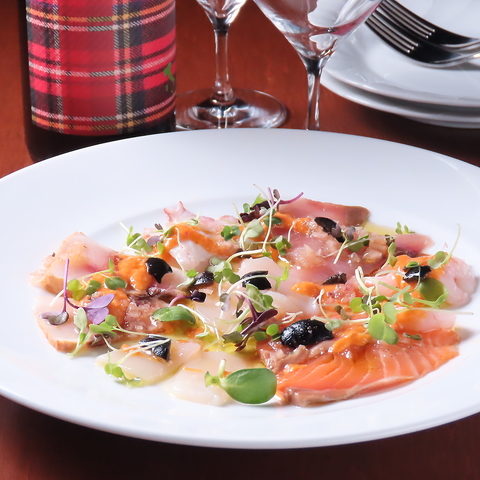 新鮮な魚介を存分に堪能できる「魚介のカルパッチョ盛り合わせ」は、まさに必食の一皿です。その時々の旬の素材を厳選した新鮮な魚介を盛り込んだ贅沢な内容。彩り豊かで見た目にも美しく、素材本来の旨味を活かしたシンプルな調理法でご提供します。最初の一皿にも最適なこの逸品を、ぜひお楽しみください。