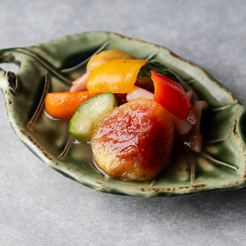 「自家製ピクルス」は、旬の野菜を使用し、更井酒店ならではのバランスで仕上げたさっぱりとした一皿です。彩り豊かな野菜をひとつひとつ丁寧に漬け込み、素材の持つ食感と風味を活かしながら、ほどよい酸味と甘みを引き出しました。