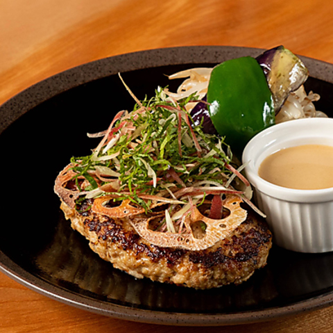 国産牛と国産豚の指定部位を毎朝塊で仕入れ、営業前に店内で挽き・練り上げる。注文が入ってから一つずつ成形し、丁寧に空気を抜いて焼き上げることで、肉本来の旨みと香ばしさを最大限に引き出す。挽きたて・練りたて・焼きたてに徹底的にこだわった、最高の状態で味わうハンバーグです。