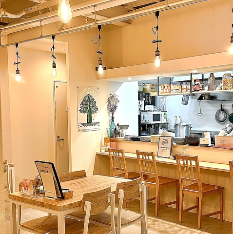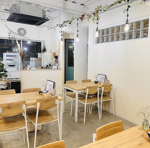 白と木目調の雰囲気でゆっくりとお食事やカフェのお時間をお楽しみください。