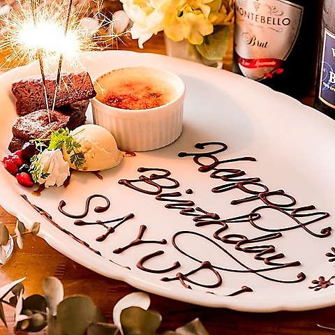 大切な方のお誕生日や記念日には、メッセージを添えた特別なバースデープレートをご用意し、サプライズのお手伝いをいたします♪お食事の最後に、最高の演出でお祝いの気持ちを伝えてみませんか?ご予約時にお申し付けいただければ、無料で心を込めてご準備いたします。その他、お気軽にご相談ください!