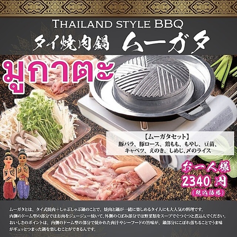 ムーガタとは、タイ式焼肉+しゃぶしゃぶ鍋のことで、焼肉と鍋が一緒に楽しめるタイ人にも大人気の料理!内側のドーム型の部分ではお肉をジュージューに焼いて、外側のくぼみ部分では野菜類をスープでぐつぐつと煮込んでください。内側のドーム型の部分で焼かれた肉汁やシーフードの旨味が、鍋部分にこぼれ落ちることでうま味がギュッとつまった鍋を楽しむことができます♪