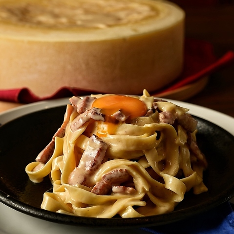 〈十勝"チーズ工房NEEDS”熟成チーズボウル〉チーズの器で仕上げる絶品カルボナーラ。目の前でチーズとパスタを絡めてご提供します。