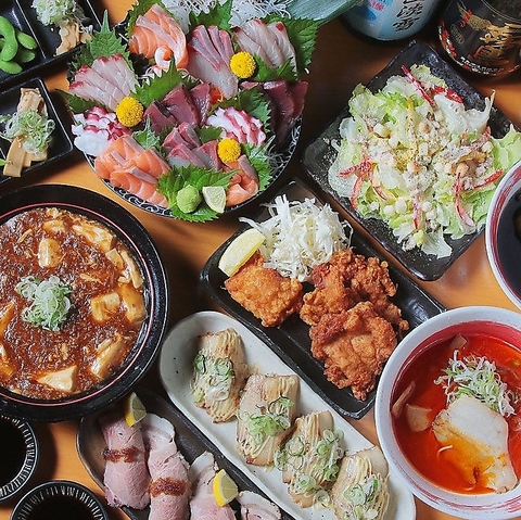 当店の人気メニューをこれでもかと詰め込んだ、宴会コース。豪華な「お刺身六種盛り」をはじめ、「おつまみ水餃子」「自家製唐揚げ」「低温チャーシュー寿司」など贅沢な全9品をご用意しました。さらに、嬉しい120分飲み放題付き!質・量ともに大満足間違いなし◎会社の飲み会や同窓会などにぜひご利用ください