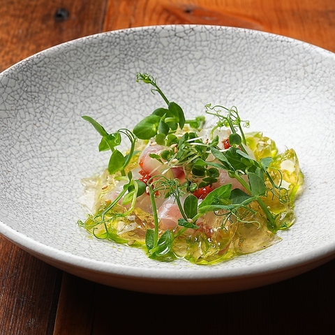 旬の紅葉鯛を薄造りで。上品な甘みとしっとりとした身質に、梅の酸味とコチュジャンのほのかな辛みが調和する一皿です。さっぱりとしながらも深みのある味わいで、季節の移ろいを感じさせます。