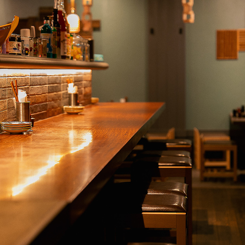 木の温もりが広がるゆったり空間。カウンターでは職人技を目の前に、テーブル席では仲間とワイワイ。照明がほんのり灯る店内で、居酒屋の賑わいとくつろぎが同居するひとときをお楽しみください。