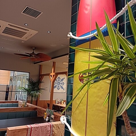 店内はサーフボードなどのレトロでお洒落な置物が並び、ゆったりとした時間を演出。ご友人との楽しい会話、お子様連れのご家族、デートなど、老若男女問わずご利用いただける明るい雰囲気で、皆様の特別なひとときを彩ります。