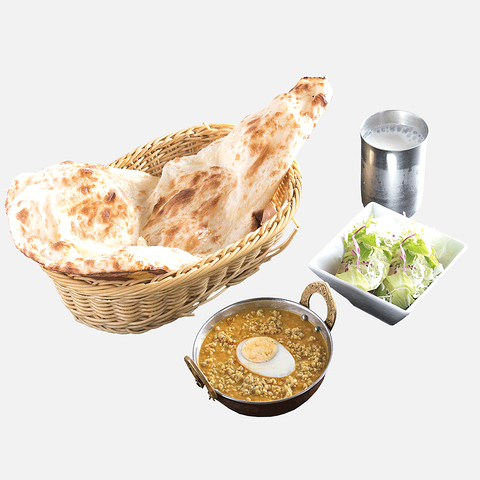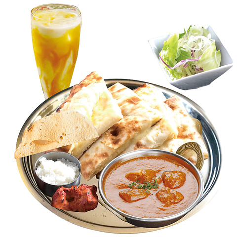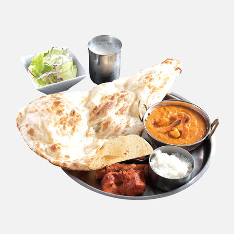 ・カレー1種類 (野菜カレーor 挽肉玉子カレーorチキンカレー or エビカレー or シーフードカレー) ・サダナン又はガーリックナン又はチーズナン・タンドリーチキン(1p)・トムヤムクンスープ・サラダ・パーパル・ソフトドリンク(ラッシー・コーヒー・チャイ・ウーロン茶 ・ジンジャエール・コーラ)
