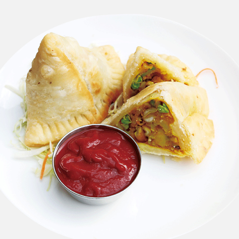 野菜、ジャガイモ、カシューナッツを小麦粉の 生地で包んで揚げたインド風コロッケ