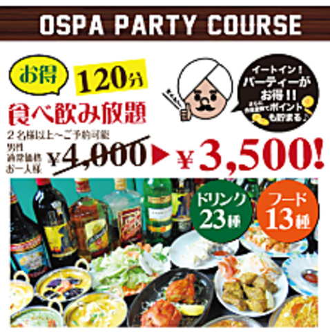 食べ放題のコースあります。お得な食べ放題コースです♪ 120分制/フード13種類/ドリンク23種類 ※Ospaクーポンとの併用はできません。 ※2名様以上よりご注文可能です。 ※こちらはイートイン(店内ご飲食)での ご予約メニューとなります。 ※10名様以上のご予約は人数選択×数量にてご予約可能です。