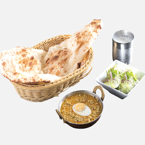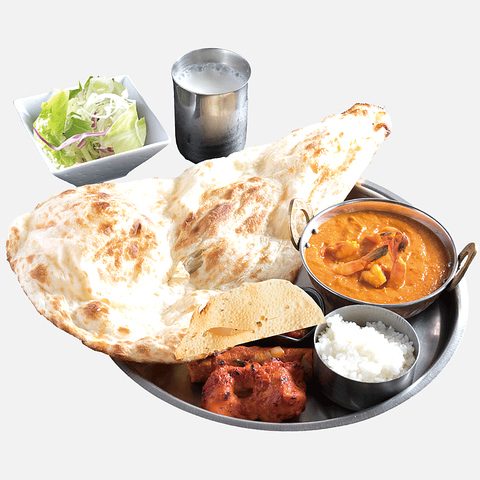 ・カレー1種類 (野菜カレーor 挽肉玉子カレーorチキンカレー or エビカレー or シーフードカレー) ・サダナン又はガーリックナン又はチーズナン・タンドリーチキン(1p)・トムヤムクンスープ・サラダ・パーパル・ソフトドリンク(ラッシー・コーヒー・チャイ・ウーロン茶 ・ジンジャエール・コーラ)
