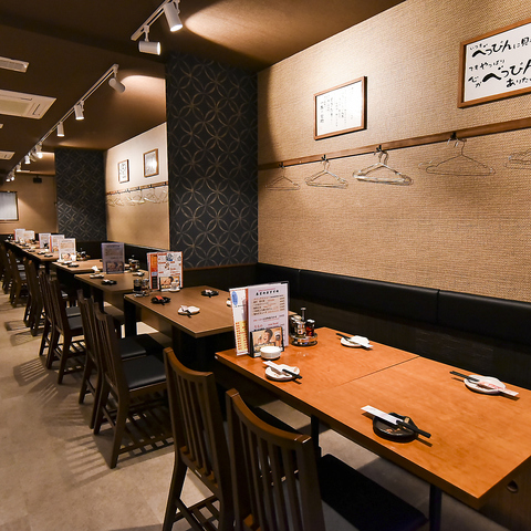 総席数66席を誇る広々とした内観で、少人数の飲み会から大人数の宴会まで対応できるのが当店の自慢です。大人数の宴会や団体様でのご利用でも、周りを気にすることなくゆったりとお過ごしいただけます。ゆとりのある空間なので、お子様連れでも安心です。活気あふれる大衆居酒屋の雰囲気の中で、自慢の料理とお酒を心ゆくまでお楽しみください