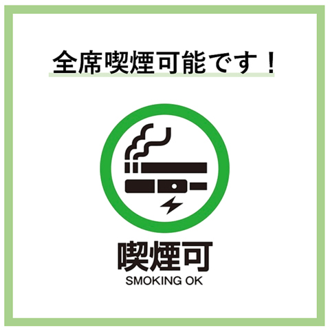 愛煙家の方に朗報です!当店は全席で喫煙が可能となっております。お席を立つことなく、お食事やお酒とともにタバコをお楽しみいただけますので、心ゆくまでごゆっくりお過ごしください♪