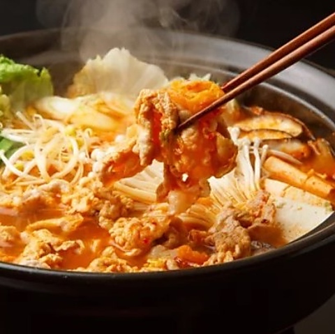 旨辛スープがやみつきになる本格チゲ鍋。コクのある特製ダシにキムチや豆腐、豚肉、野菜の旨みが溶け込み、体の芯から温まる一品です。ピリッとした辛さの中に深い旨みを感じる味わいで、寒い季節はもちろん、一年を通して人気の鍋メニューです。