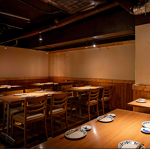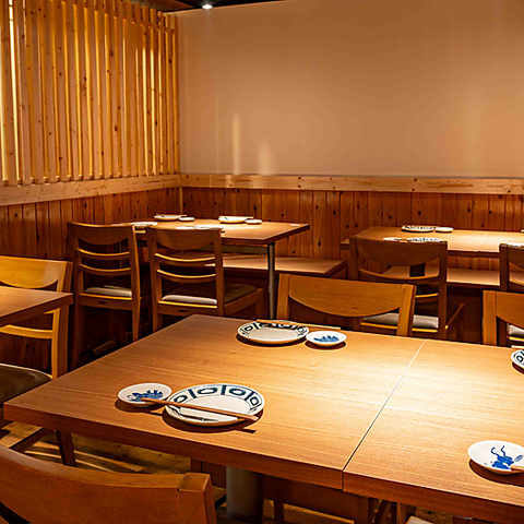 【広々としたテーブル席】 木の温もりに包まれた「笑山」は、笑顔が集う場所。活気あるテーブル席で語らい、カウンターや掘りごたつも完備。最大40名の大人数宴会も承ります。