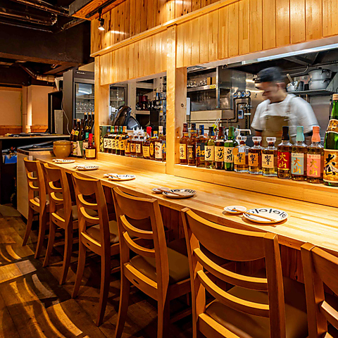 【カウンター、テーブル、掘りごたつ。多様な席で「笑山」を堪能】木材の自然な風合いを活かした空間は、居心地の良さを追求。活気ある調理風景を楽しめるカウンター、少人数で使いやすいテーブル、そして掘りごたつでゆったりと。各種宴会・貸切は最大40名様まで承ります。お客様の笑顔が集う場所、それが「笑山」です。