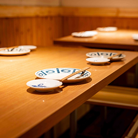 【「笑山」の掘りごたつ席でゆったりと広々とした宴会空間も魅力】 木目の美しさが際立つ落ち着いた内装が自慢。お一人様で気軽に立ち寄れるカウンター、カジュアルなテーブル席に加え、団体様には足を崩せる掘りごたつ席が最適です。40名様規模の宴会にも対応し、心温まる雰囲気の中で、賑やかなひとときをお約束します。