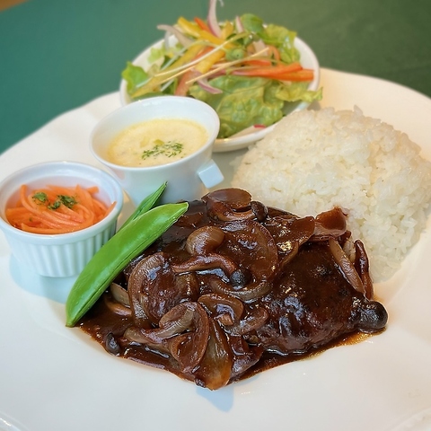 サラダ・人参ラペ・スープ・煮込みハンバーグ・ライス・ドリンク