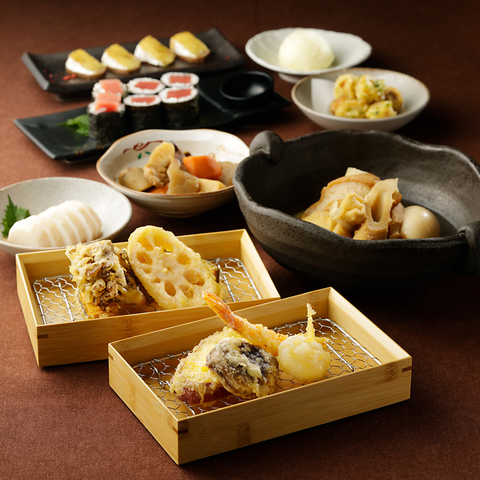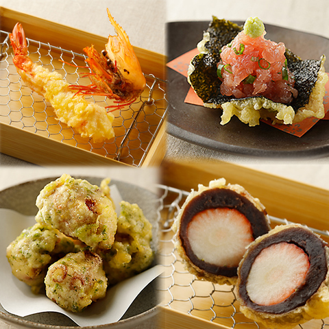 旬を迎える野菜や海鮮。軽い衣で揚げた天ぷらは、旬の味覚をダイレクトに味わえます。変わり天やつまみ天、甘天など珍しい天ぷらも多数ご用意しておりますので、お好みの天ぷらをお楽しみください♪