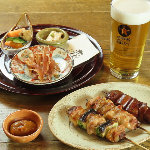 備長炭の強火で一気に焼き上げたねぎまは、鶏の旨味が溢れ出すジューシーな仕上がり。隣に添えられたレバーは、炭火で驚くほど濃厚でとろけるような食感に。焼き上がりを待つ間は、彩り豊かな前菜を。一口ごとに素材の味が引き立ち、冷えたビールや日本酒との相性も抜群です。