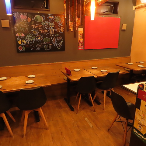 木目調のインテリアと柔らかな照明が包み込む、落ち着いた大人の空間。ゆったりと配置されたテーブル席は、お仲間との飲み会や、大切な人との語らいに最適。かしこまりすぎない、でも上質な。そんな絶妙な空気感の中で、焼き立ての串と厳選された日本酒をお愉しみいただけます。