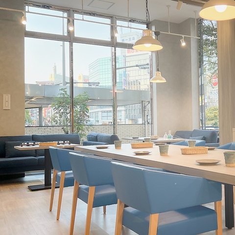 明るく開放的な空間に、鮮やかなブルーのチェアが並ぶスタイリッシュな店内。シンプルな木目のテーブルと白いレンガ調の壁が、洗練されたカジュアル感を演出。自然光が差し込む窓際で、ゆったりとした時間を過ごせる心地よい空間です。