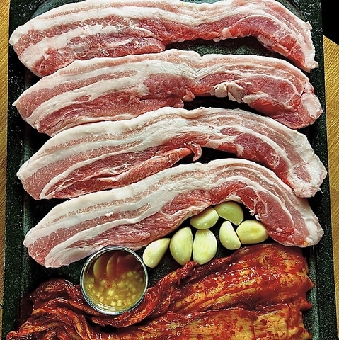 希少な済州島式サムギョプサル。香ばしく焼き上げる専用鉄板と、お店独自の味付けが決め手!ジューシーな鹿児島黒豚の旨みを最大限に引き出します。本場そのままの味を再現した逸品を、開放的な店内で心ゆくまでお楽しみください。(肉追加 150g1,200円)