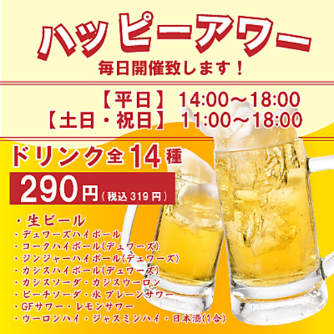 平日は14時~18時、土日祝は11時~18時限定でハッピーアワー実施中!生ビールやデュワーズハイボールをはじめ、サワー・カクテル・日本酒まで全14種類が一律290円(税込319円)で楽しめます。昼飲みや早めの一杯にぴったりの時間帯、お得に乾杯しませんか?