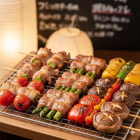 人気の串が楽しめる「焼鳥コンボ」や「野菜巻きセット」、スピーディーメニューの「ポテトサラダ」や「ネバネバサーモン」などメニュー豊富にご用意しております!焼鳥コンボは、ジューシーなもも肉やパリッとした皮、ぼんじり、砂肝、鶏レバー、ねぎまの盛り合わせの贅沢な一皿です☆ビールとの相性も抜群なので、ぜひ一度味わってみてください