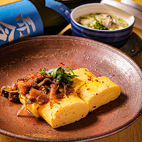 《きまぐれ葉の間》自慢の人気メニュー、牛しぐれだし巻き。甘辛く炊いた国産牛のしぐれ煮を、ふんわり出汁香る玉子でやさしく包み込みました。ひと口頬ばれば、じゅわっと旨みと甘みが広がり、思わず笑顔に。熱々を頬張る幸せをぜひご堪能ください。