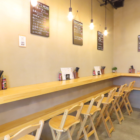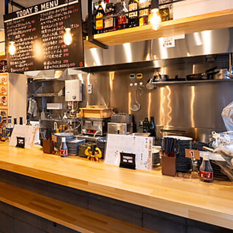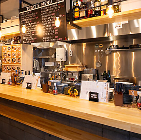 本日のオススメを報せる黒板メニューが頭上に掲げられたカウンター席では、調理風景を眺めながら心地良い時間をお過ごしいただけます。店内は木の温もりが溢れる清潔感のある空間となっており、初来店の方や女性のお客様でも気軽に入りやすい雰囲気。