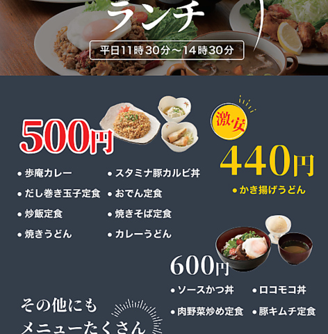 多彩なランチメニュー440円~の衝撃価格夜定食も充実格安600円シリーズ大好評!
