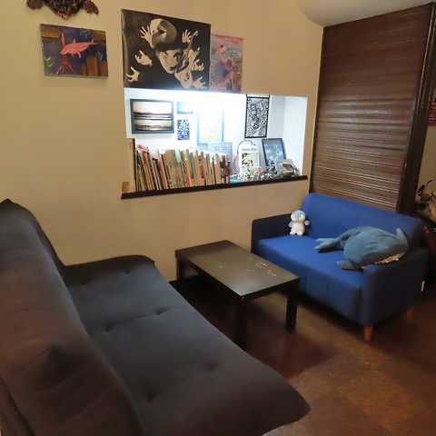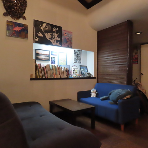 青を基調にした幻想的な店内。心が静かに沈み、穏やかに整う癒しの空間。お客様が持ち込んで飾った絵やアートが多い店内。ハンドパンの音色が優しく響く。