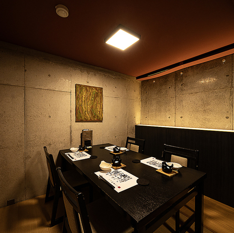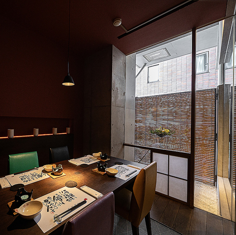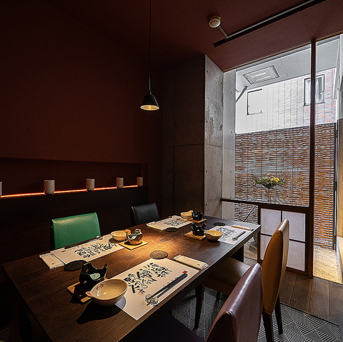 最大4名様までご利用いただける完全個室のテーブル席。落ち着いた雰囲気の中庭が見える、接待やデートにぴったりなおしゃれな空間です。