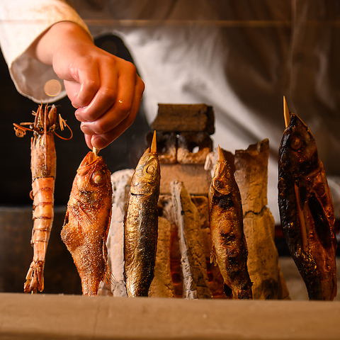 「炭火でじっくり焼き上げる旬の味覚、炉端焼きで贅沢なひとときを。」