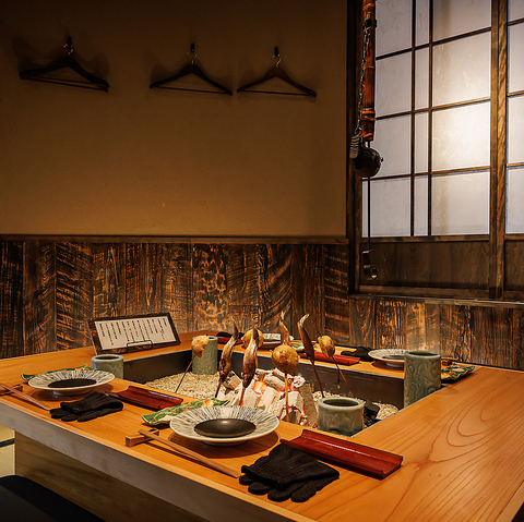 【非日常の雰囲気とおもてなし】普段では味わえない囲炉裏を囲んだ席が魅力的な個室を準備しております。囲炉裏を囲んで焼き上げる料理はスタッフが焼き加減を見ながら必要最低限の対応で見極めます。個室の中への出入りは出来る限り控えてお客様のお時間を大切にします。