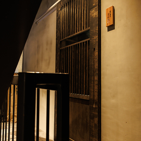 【ビルの中にある個室の空間】明るいビルの階段を進むと現れる和風の扉をくぐると落ち着いた囲炉裏を囲うお客様だけの空間。