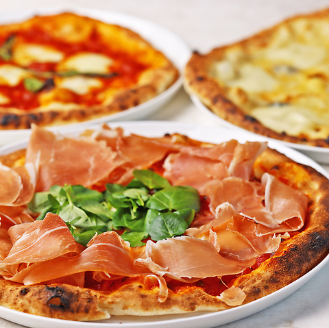 店舗に設置された専用のピザ窯で焼き上げる本格ナポリピッツァが楽しめる♪ピッツァだけじゃなく熱々のチーズや新鮮なサーモン料理、国産牛の黒毛牛ステーキも必見!