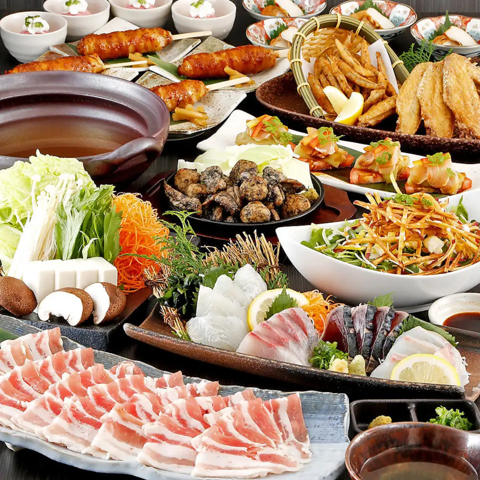 ◆お料理のみ4500円(税込)◆ご宴会や飲み会、誕生日のお祝い等の演出をお手伝い♪「横断幕特典」「寄せ書き焼酎ボトル」もご用意♪(4日前迄のご予約)。刺身4種盛合せやはかた地どり入りつくねとせせりの炭火焼き風、鹿児島県産黒豚のしゃぶしゃぶや茄子とはかた地どりの生ハムカルパッチョ風などが楽しめるコースです。