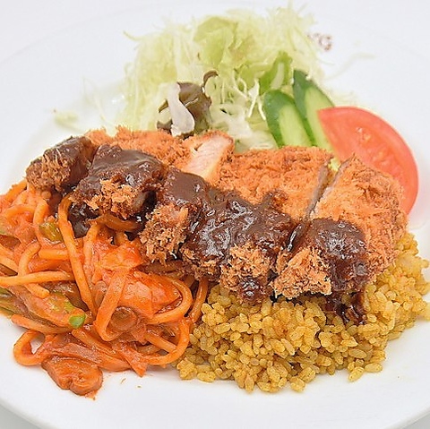 柔らかい三元豚のポークカツとナポリタン、ピラフの贅沢ワンプレート。お腹を空かせてお越しください!