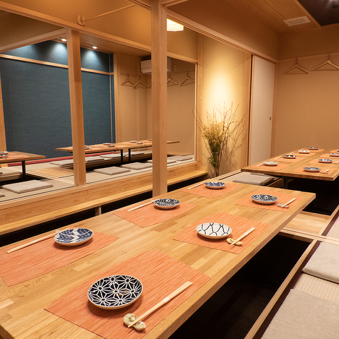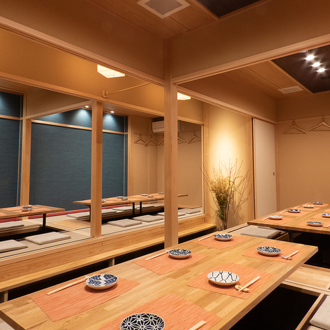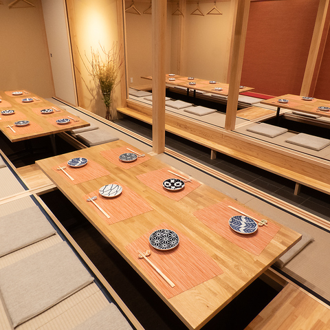 周りを気にせずにお寛ぎいただける、掘りごたつ式の完全個室を完備しております。靴を脱いで足を伸ばせるリラックス空間で、プライベートな時間をお過ごしください。4名様から最大30名様までの団体様まで対応可能で、少人数でのお食事から、会社宴会、大人数での忘新年会まで、幅広くご利用いただけます。特別なひとときをお過ごしください。