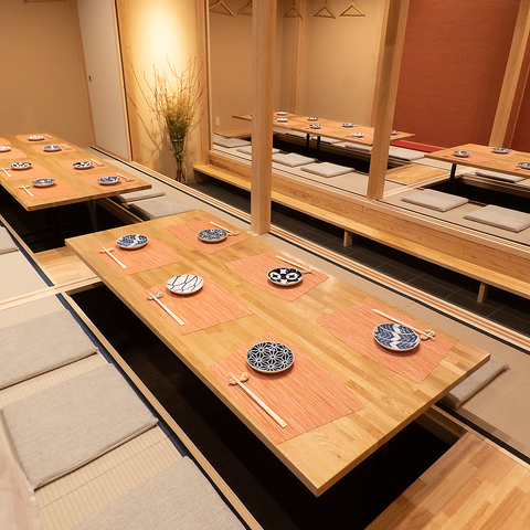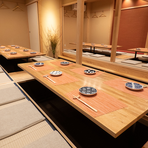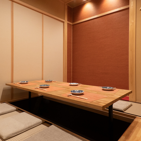 足を伸ばしてゆっくりと寛げる掘りごたつ式の完全個室です。4名様からご利用可能で、大切な接待やご家族での会食、記念日など、プライベートなシーンでのご利用におすすめです。