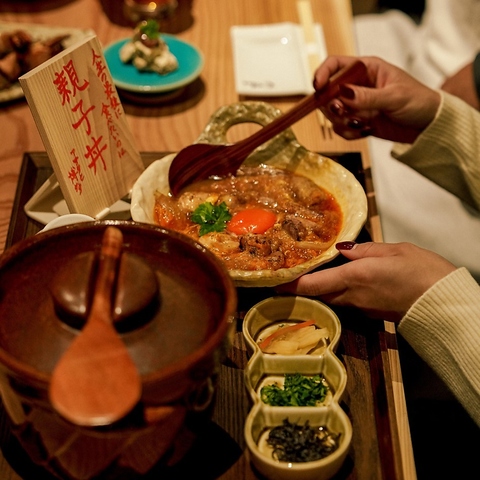 親子丼を締めの一品としてご用意しました◎特製のタレでふっくらと煮た鶏肉とトロトロの卵に加え、中央には艶やかなオレンジ色の濃厚な卵黄をトッピング♪全てを絡めて頬張れば、思わず「人生の最後に食べたくなる」ような至福の美味しさが広がります。ぜひご賞味ください!
