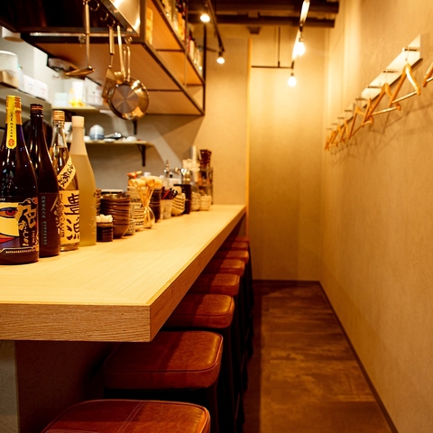 会話が弾むテーブル席、ゆっくり飲みたい方はカウンター席へどうぞ♪心地よい照明が温かみを感じさせ、心を和ませる空間を演出しています。棚に並んだこだわりのお酒と共に、旬の料理を楽しみながら、日々の疲れを癒す贅沢なひとときを。デートや仕事帰りにもぴったりな雰囲気。ぜひ心ゆくまでお楽しみいただき、特別な時間をお過ごしください。