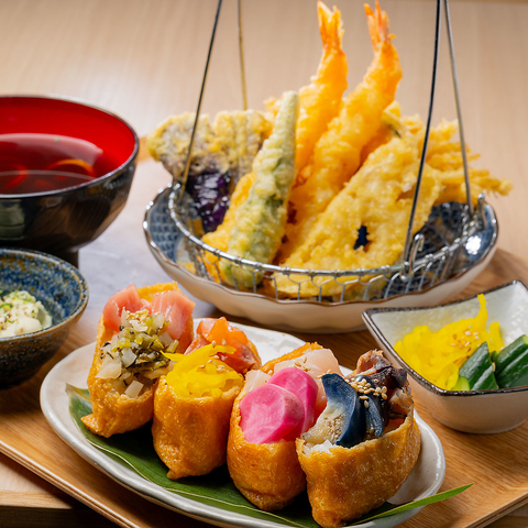 彩り豊かな進化系いなり寿司と、揚げたてサクサクの天ぷらを一度に楽しめる贅沢な御膳です。マグロやサーモン、お漬物を美しく盛り付けた「オープンいなり」は、目でも舌でも楽しめる逸品。大きな海老や季節の野菜が主役の天ぷらは、食欲をそそる黄金色の仕上がりです。和の趣を感じる、華やかなお食事をお楽しみください。