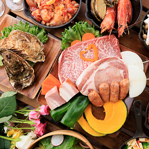 肉の旨み、海老の食感、牡蠣の濃厚さを旬野菜と共に。香ばしい香り漂う贅沢BBQを♪