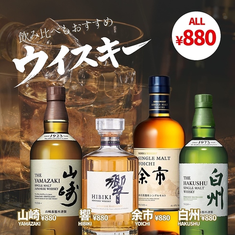 | ウイスキー | ウイスキー・ロック・ハイボール・ジンジャーハイボール・水割り・ウィスキーコーク |