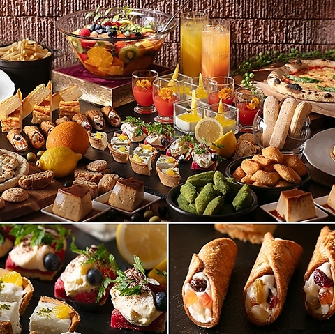 ティラミスやマチェドニア、カンノーロやドルチェピッツァなど、色とりどりのドルチェが彩る華やかなスイーツブッフェ。ときめきあふれる甘いひととき。