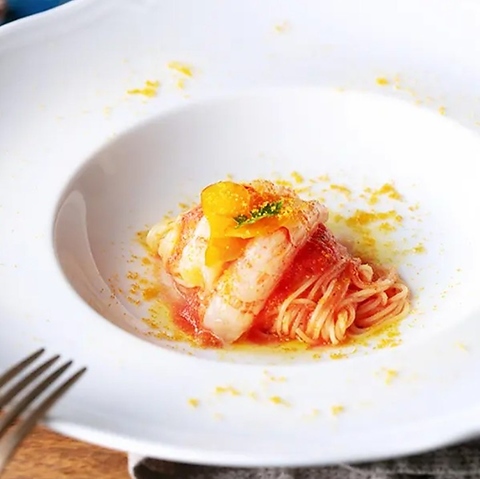 自然派イタリアンの第一人者・植竹隆政シェフが手がける「エッセンツァコース」。このコースは、冷製カッペリーニのスペシャリテをはじめ、旬の魚介類や黒毛和牛など厳選された素材を活かした構成です。動物性油脂を控え、素材の旨みを最大限に引き出す繊細で奥深い一皿一皿をお楽しみください。※前日までの要予約コース。